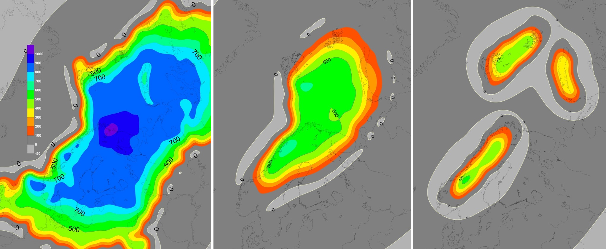 Figur 2. Glasial isostatisk respons av isen i de tre istids-fasene. Til venstre for den siste million år, i midten for 2,4 – 1,0 million år, til høyre for 3,5 – 2,4 millioner år. Rødlig farge viser heving 100-300 m; gul 300-400 m; grønn 400-700 m, og blå 700-1100 m. Lys grå farge viser ‘forebulge’. Klikk for større figur.