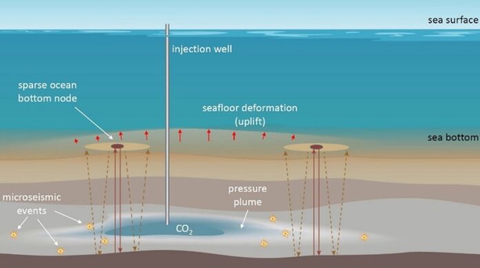 Noder på havbunnen (røde sirkler) kan overvåke trykk og CO2-metning i et reservoar. Nodene kan gi ytterligere relevant informasjon ved å registrere havbunnsheving og mikroseismiske hendelser. Kilde: SPARSE