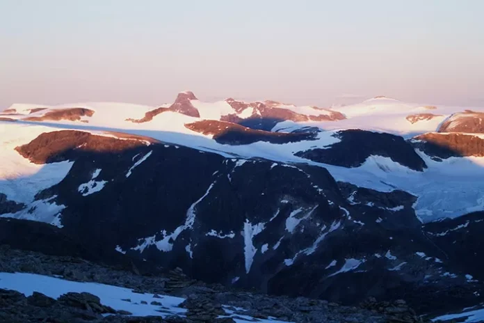 Et fjell. En fjellheim. En fjellkjede. Utsikt fra Skålatårnet mot Lodalskåpa i sørøst, en nunatak på Jostedalsbreen.