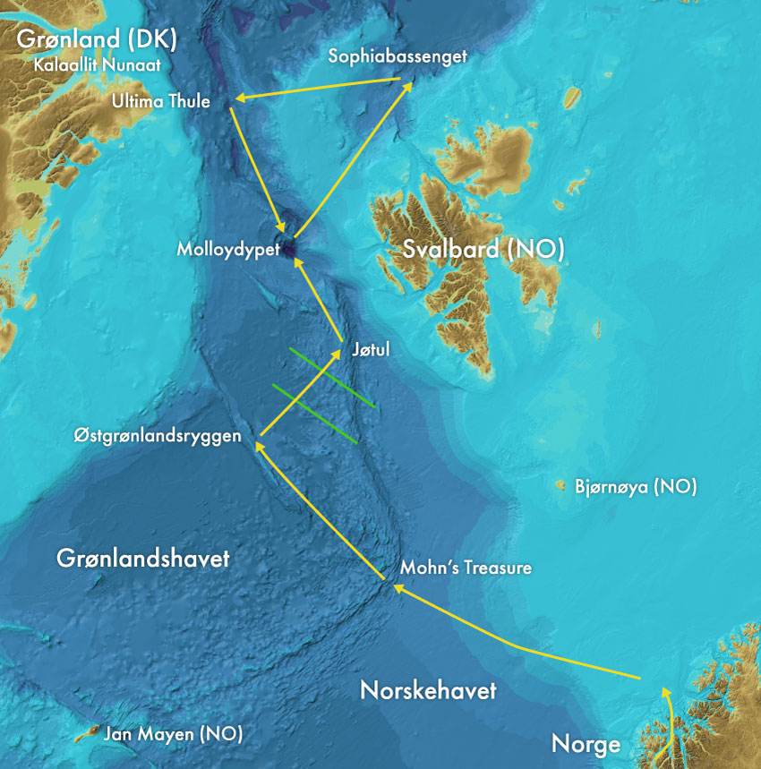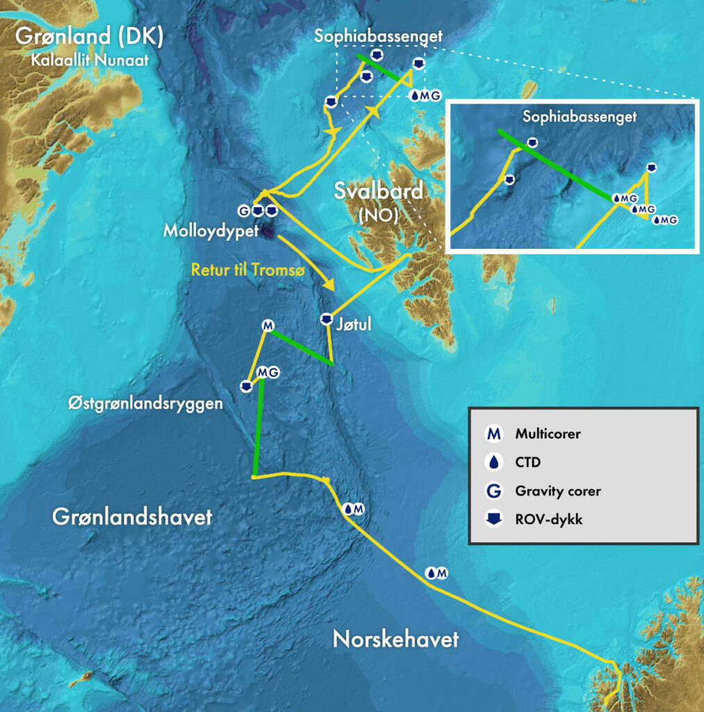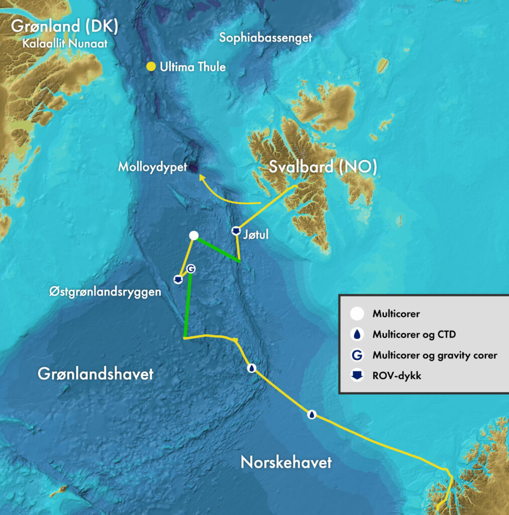 Den buede pilen øverst på kartet viser kursen etter avgang fra Longyearbyen. Målet nå er å ta sedimentprøver i området nær Molloy-dypet og gjennomføre et ROV-dykk.