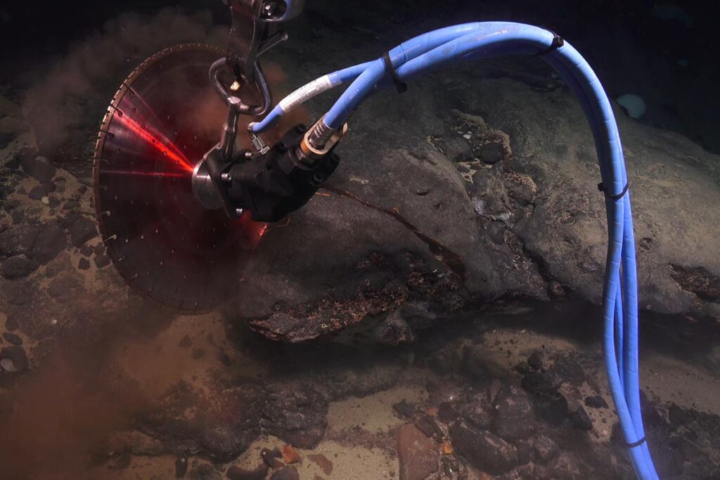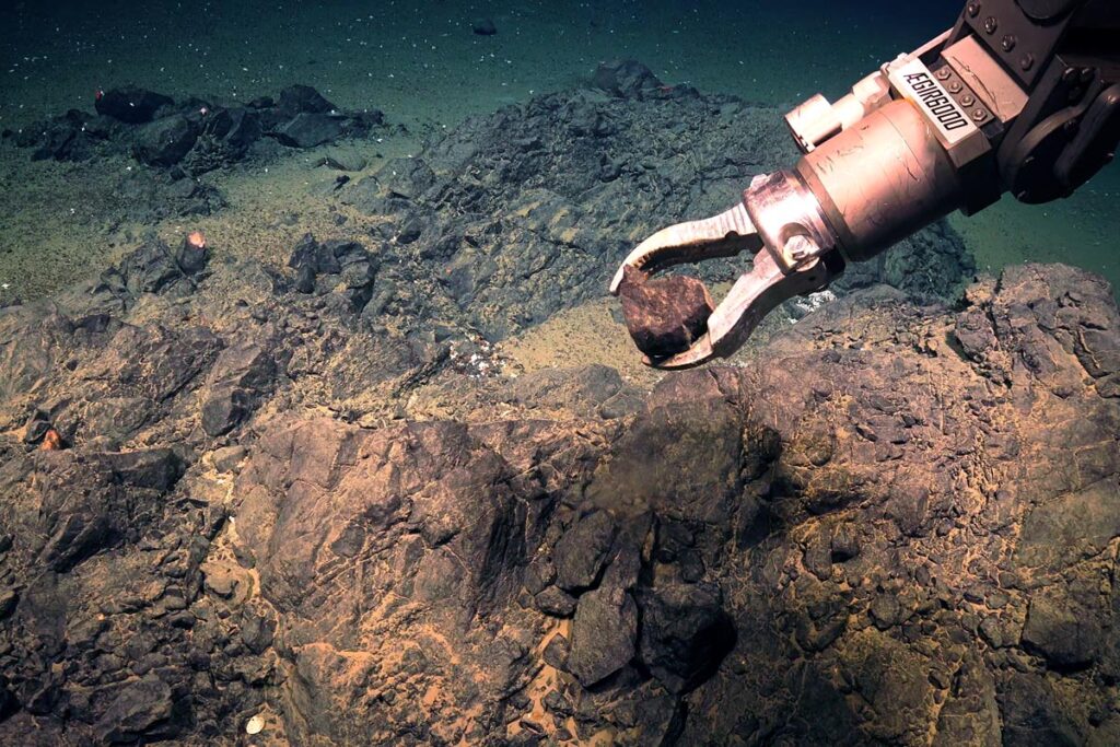 ROV-en sager ut en bergartsprøve fra Østgrønlandsryggen. Foto: Ægir 6000/NORMAR