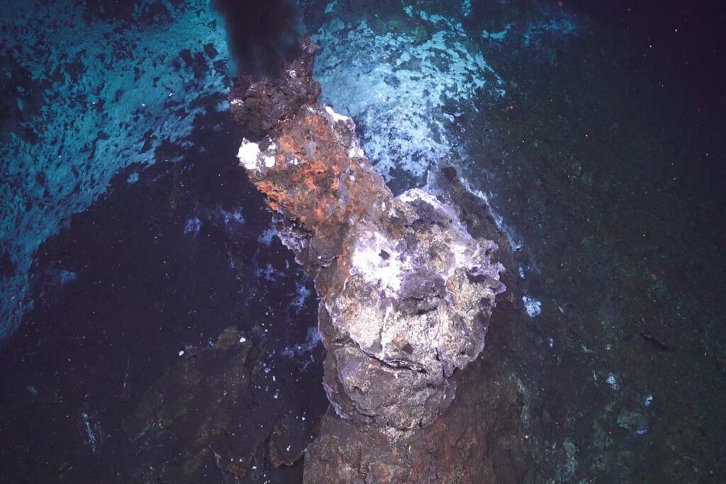Den svarte skorsteinen Fenris ved det hydrotermiske feltet Jøtul med karakteristisk svart «røyk». Foto: Ægir 6000/NORMAR