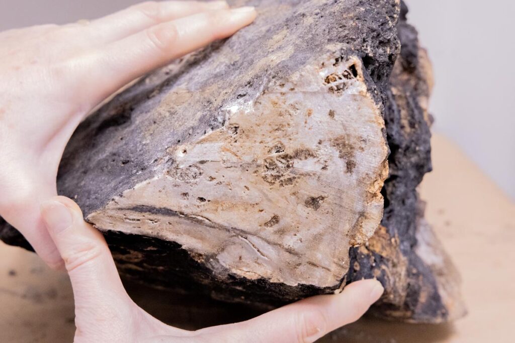 Denne prøven vekker særlig interesse blant geologene. Den ligner kalsiumkarbonat (altså kalkstein) dannet ved sedimentasjon, men små bobler i strukturen tyder på at den kan ha vært utsatt for varme. Det trengs mer detaljert analyse i laboratoriet for å kunne fastslå det. Foto: Daniel Albert, GoNorth/SINTEF