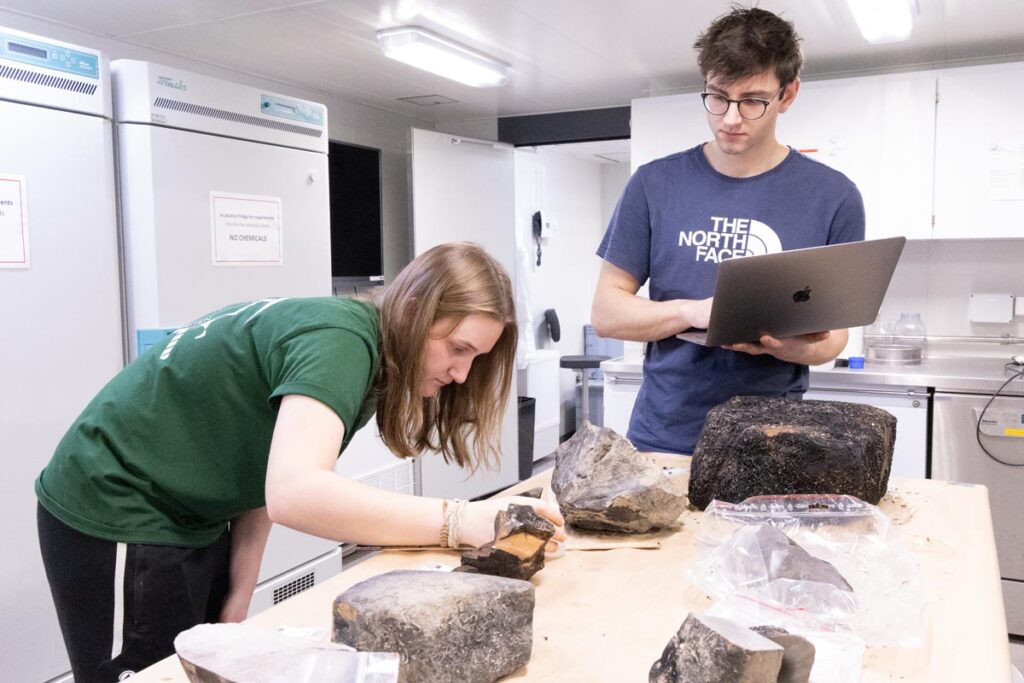 Julia Göllmann (UiB) og Julius Anton Friedrich (UiT) i gang med å katalogisere og beskrive prøvematerialet. Foto: Daniel Albert, GoNorth/SINTEF