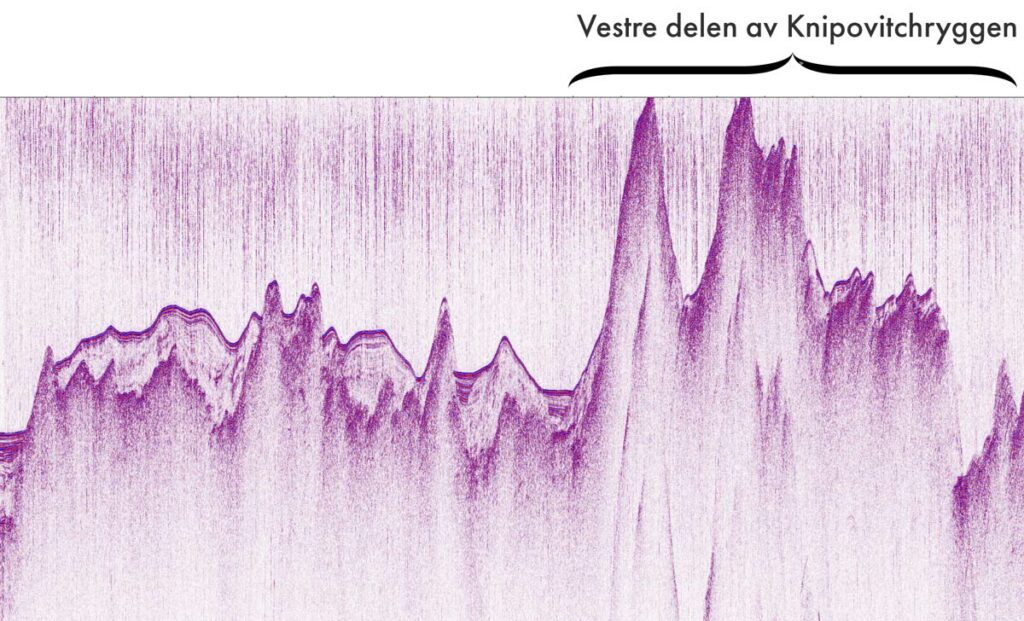 Den andre seismiske linjen på toktet. Profilen viser en svært ujevn topografi, med to markante topper ved starten av selve ryggen og en dyp forsenkning midt i strukturen (helt til høyre i bildet). Kilde: GoNorth
