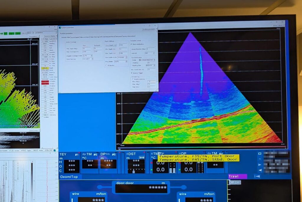 Et utsnitt fra skipets multistråle-ekkolodd viser søylen som et lysere blått signal mot den mørkeblå bakgrunnen. Foto: Nil Rodes